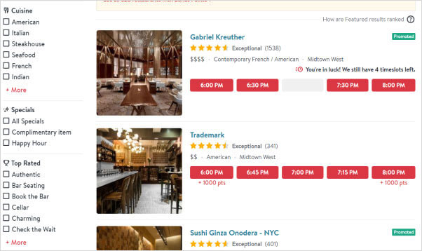 The list of restaurants shown to users is based on distance, available reservation time, rating and customer reviews. Besides, users can search for a specific restaurant, area, or city and filter the list of restaurants by cuisine, rating, seating options, price, and time slot.